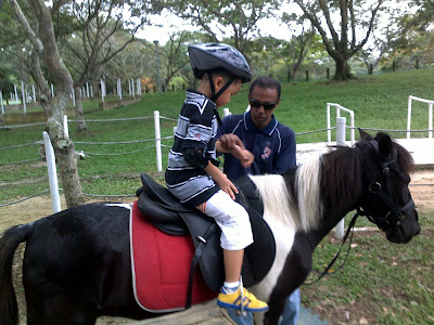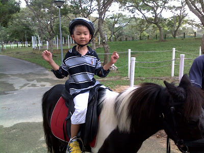 Last weekend R brought the boys to Pasir Ris Park. They were there for a bicycle ride and brought their bikes. After the bike ride Ryan decided to have a go on the ponies which were there at the park. It was his first time on a pony and he enjoyed his $10 ride thoroughly.